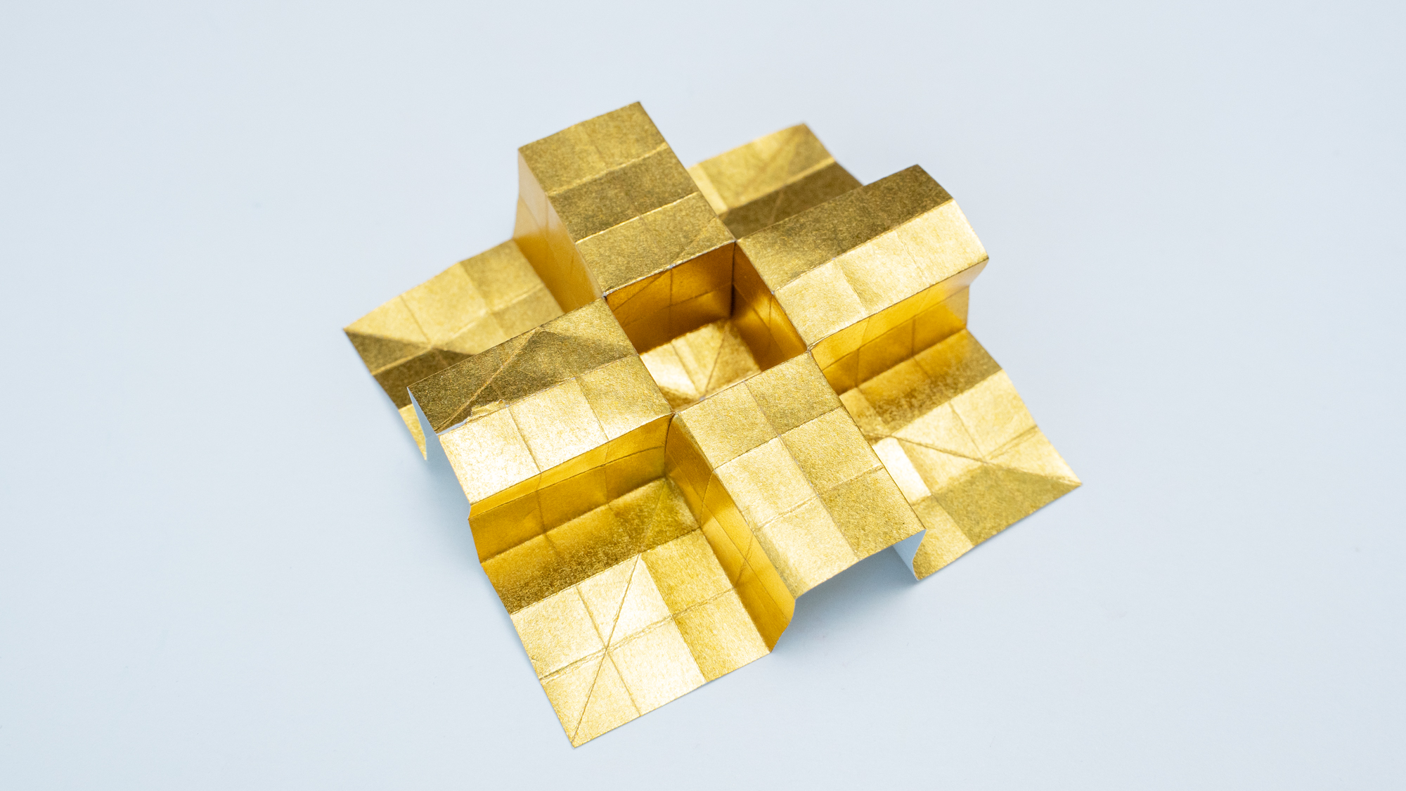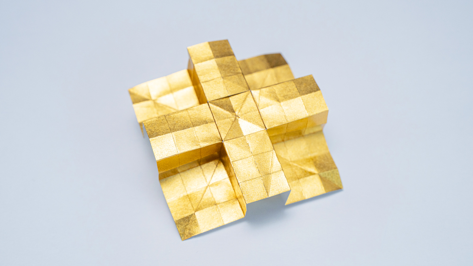 When such non-flat origami molecules are used to create shapes, a clear tendency emerges: surfaces become clearly segmented and edges are emphasized. The resulting forms often resemble polygonal models seen in early 3D video games.