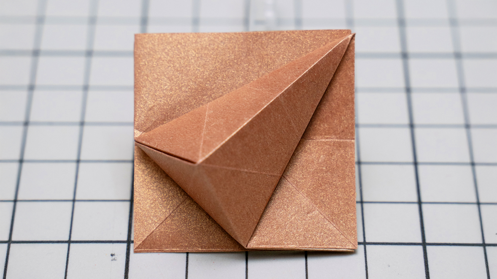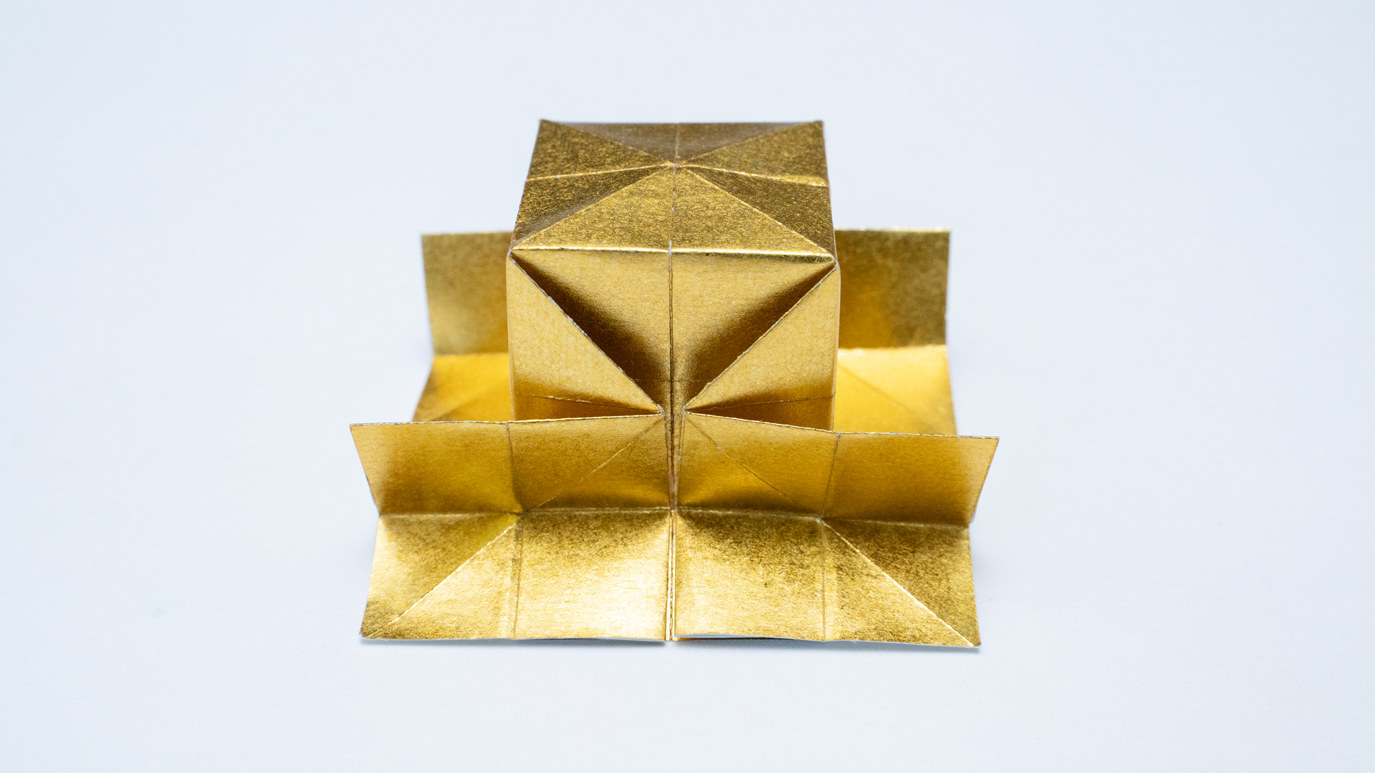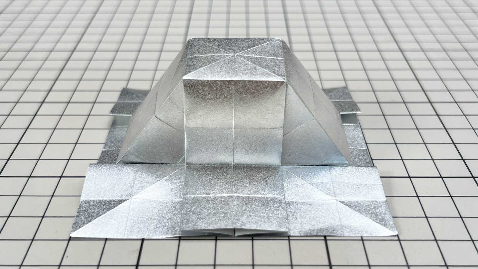 A structure formed by vertically compressing an obtuse triangular pyramid using a three-dimensional sink-fold technique.