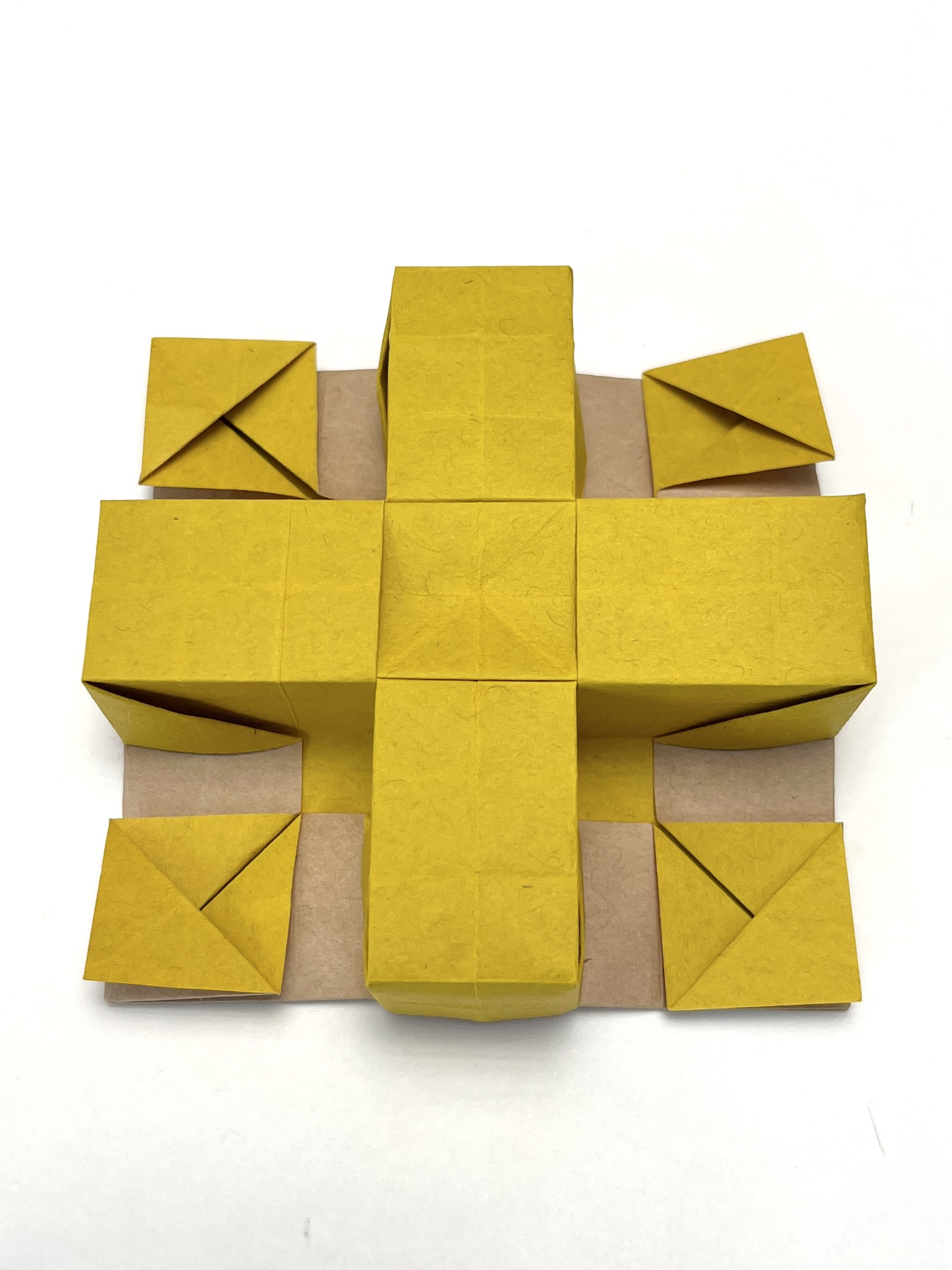 A prototype for making a fully three-dimensional cross shape, rather than a bas-relief. It uses a 13-grid or 15-grid layout. The leftover corner kado are tucked into pockets on the walls.